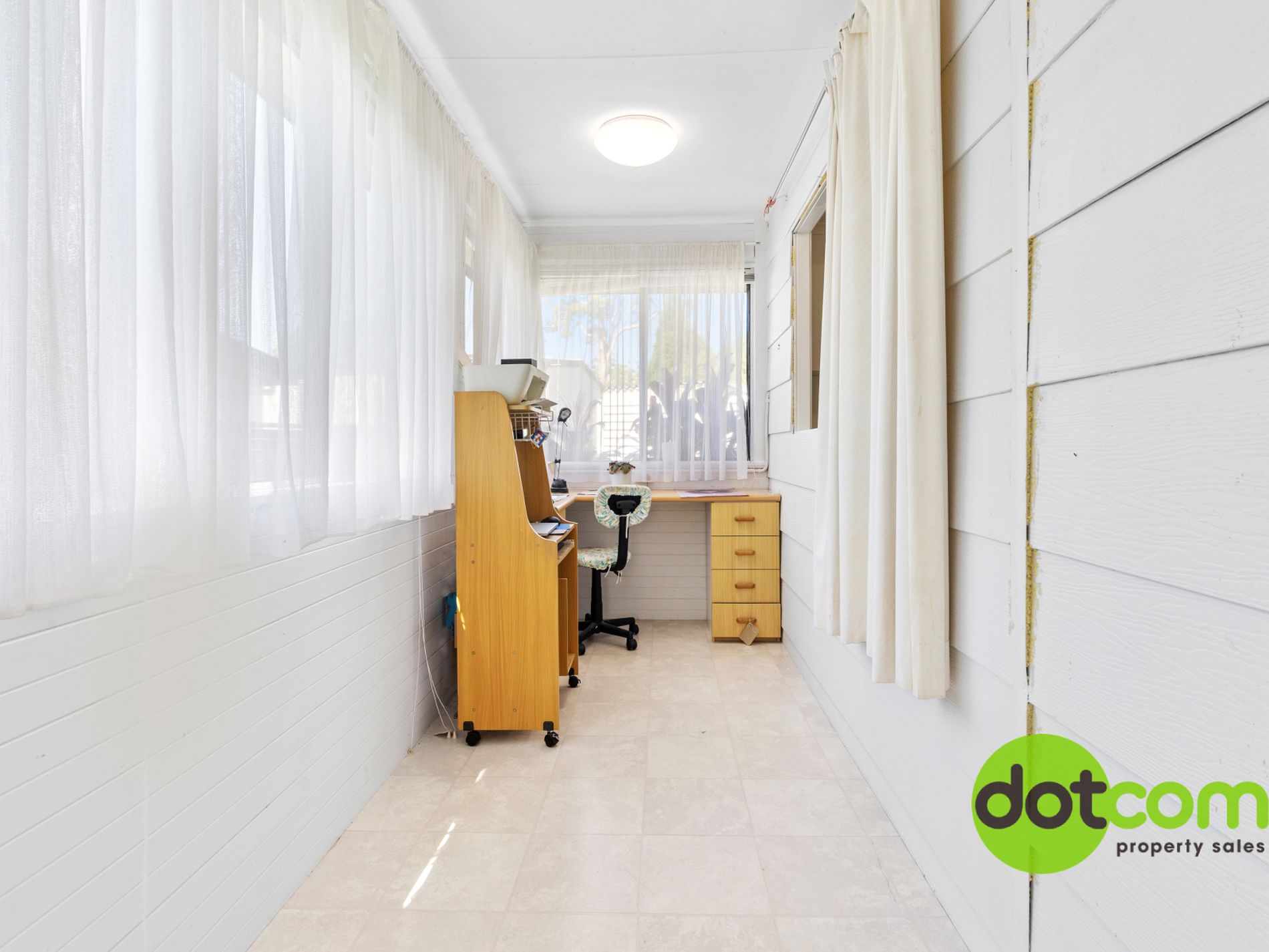 The lounge room is air-conditioned with a Hitachi reverse cycle air-con plus a fan, large windows bringing ample light and vinyl floor for easy cleaning. It opens to the enclosed sunroom (used also as study). There are outside Awnings keeping the house cool.
