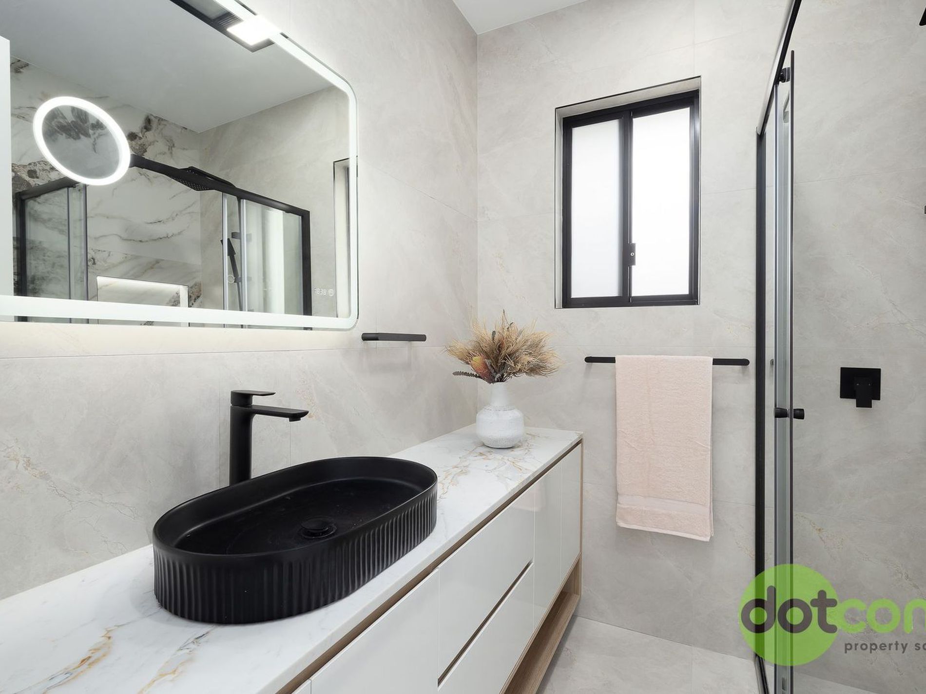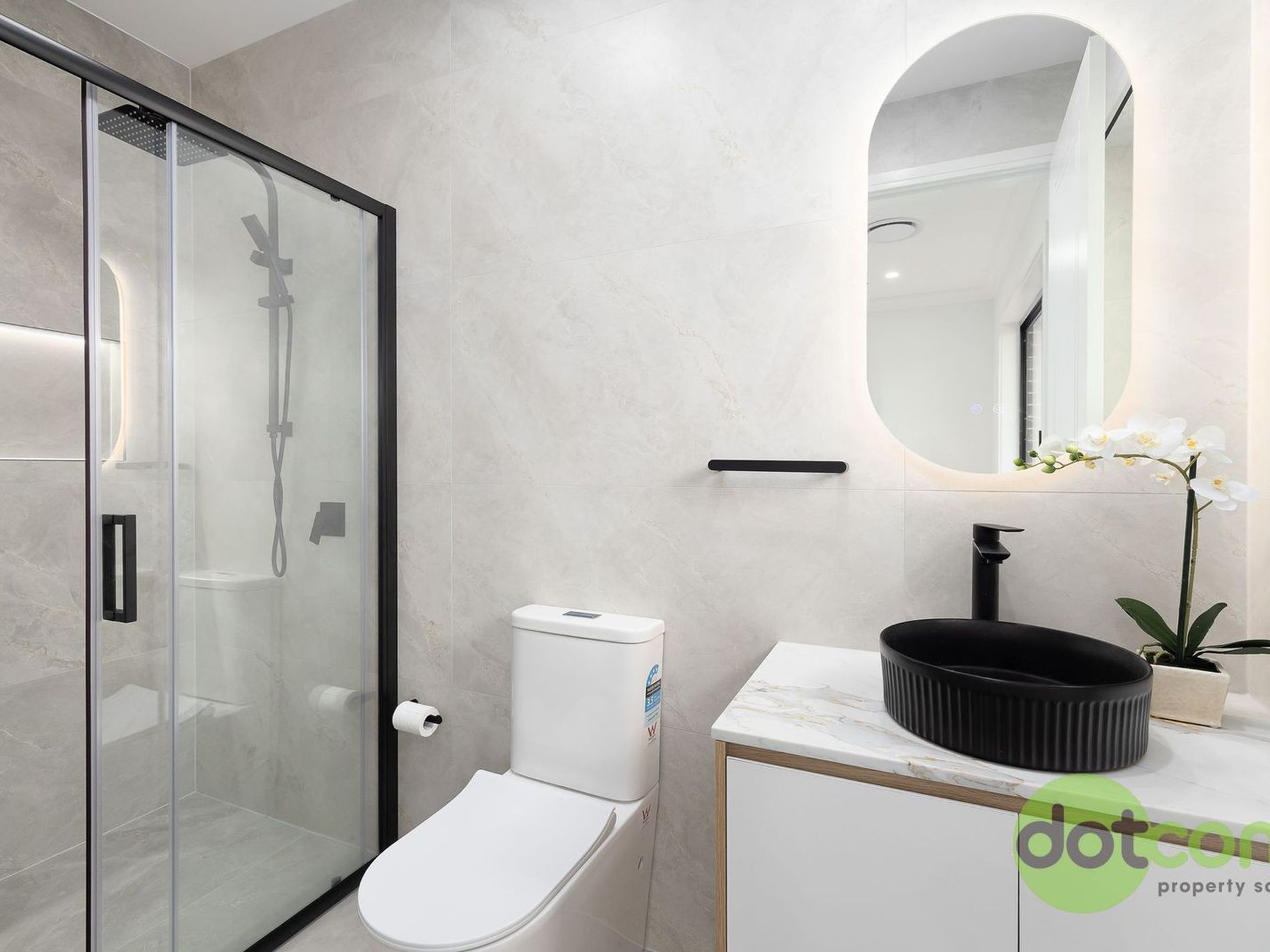 - Floor-to-ceiling tiles, stone benchtops & touchscreen vanity mirrors