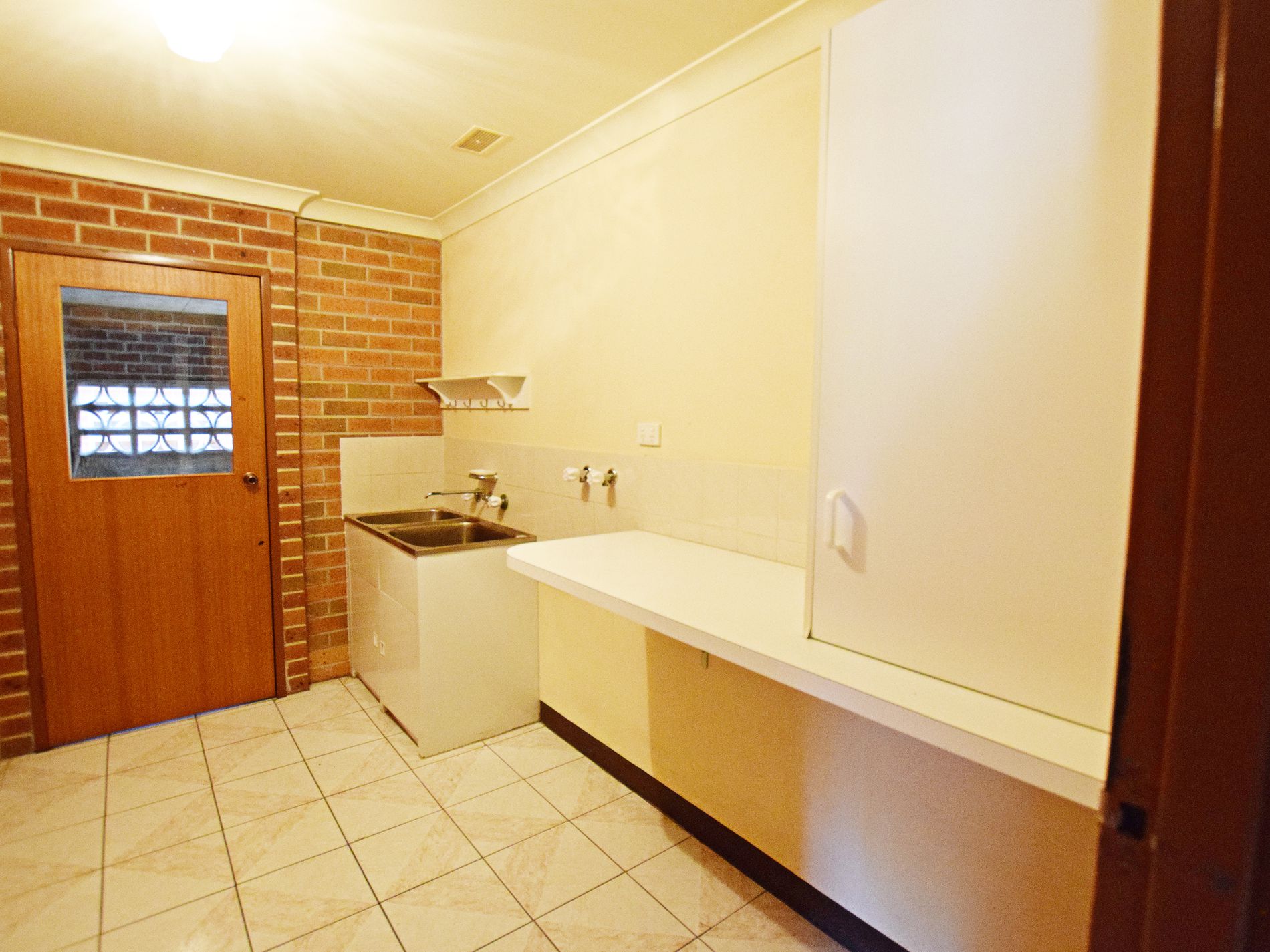 The laundry is large with a double sink, bench and cupboard space.